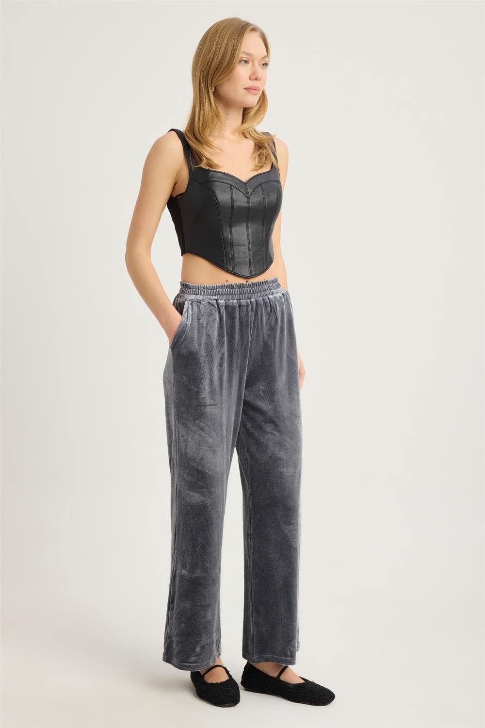 Pantolon Kadife 2 Cep Bel Lastikili Bol Paça