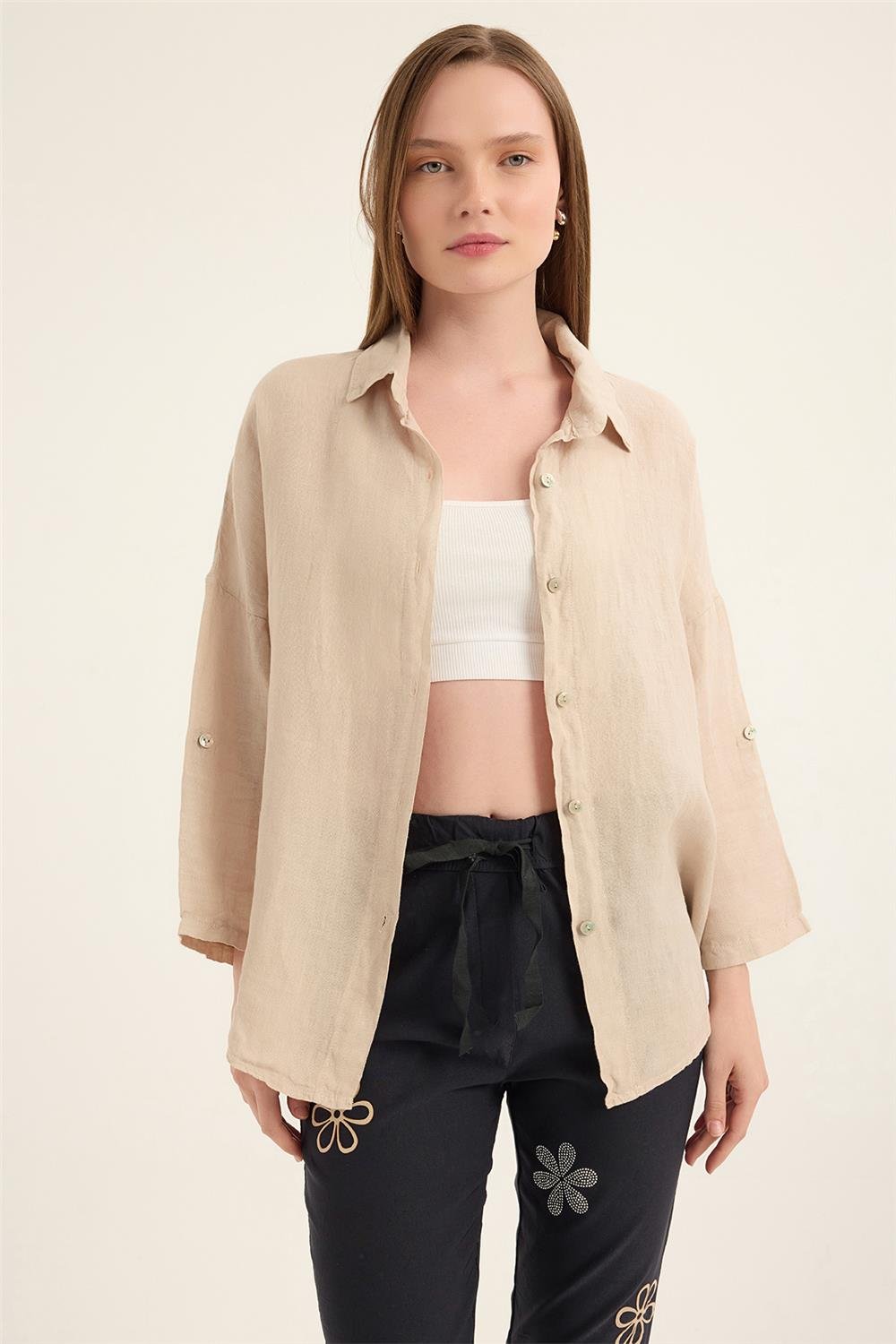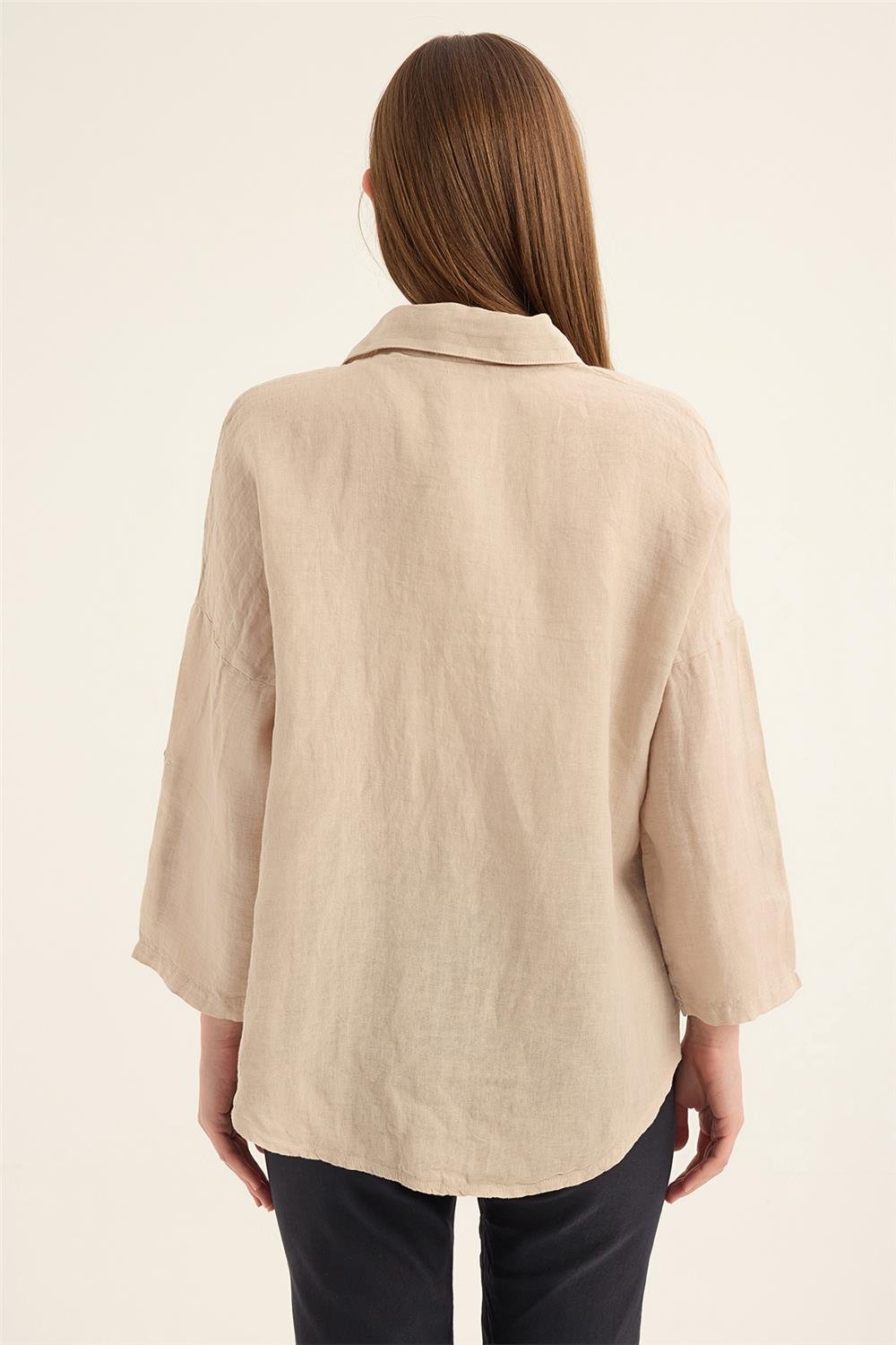 Gömlek Keten Katlı Kısa Kol