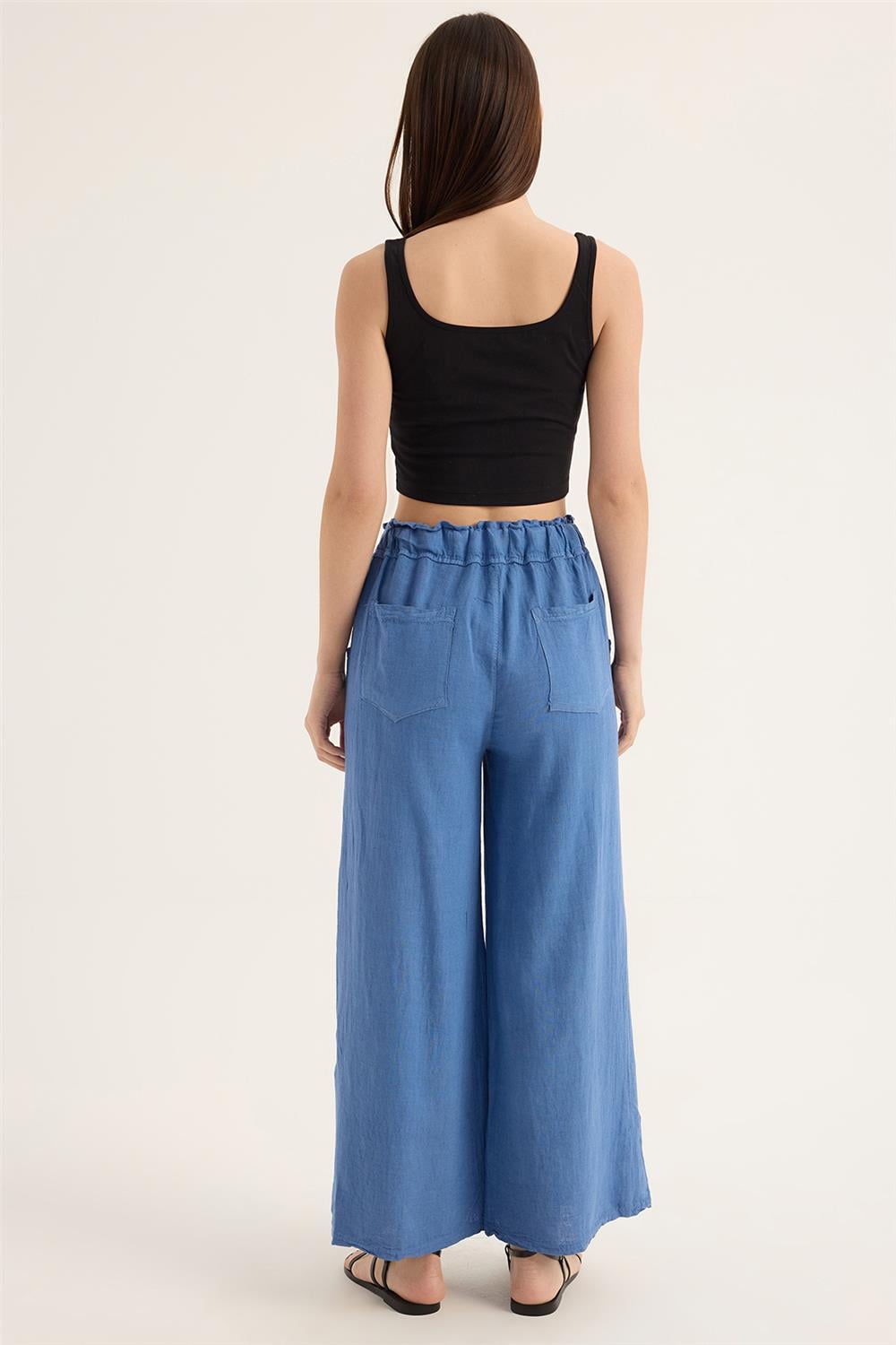 Pant.Keten Taşlı Çiçek Yamalı Bel Lastikli Bol Cepli