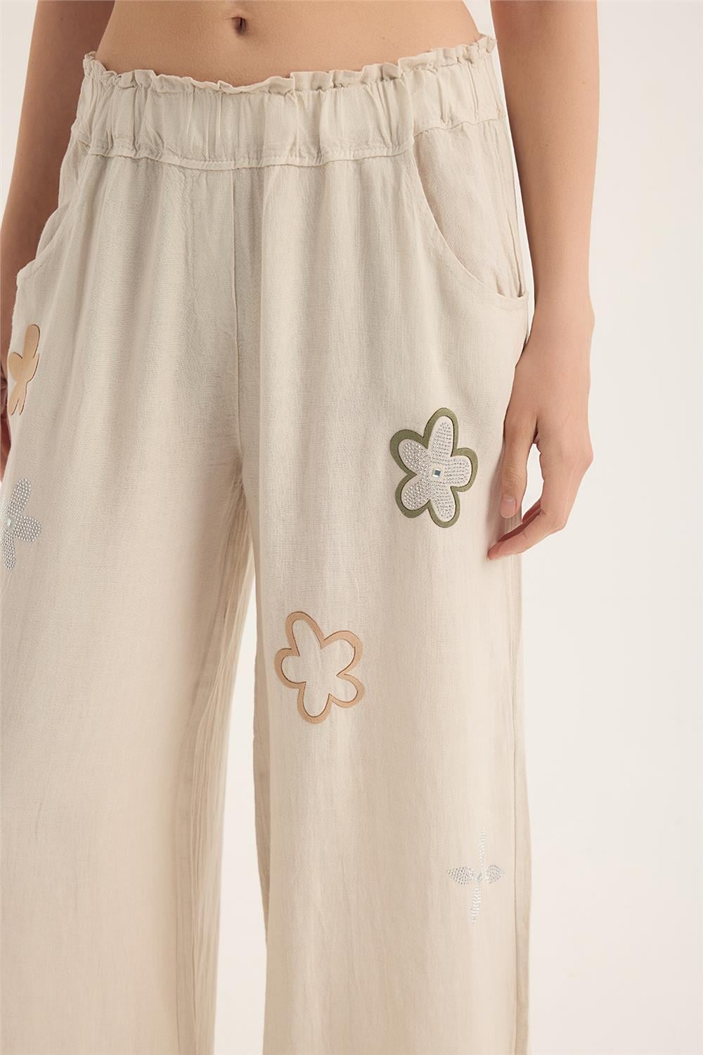Pant.Keten Taşlı Çiçek Yamalı Bel Lastikli Bol Cepli
