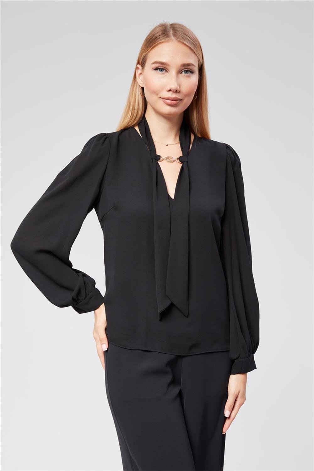 Bluz Kuşak Geçmeli V Yaka Metal Aksesuarlı