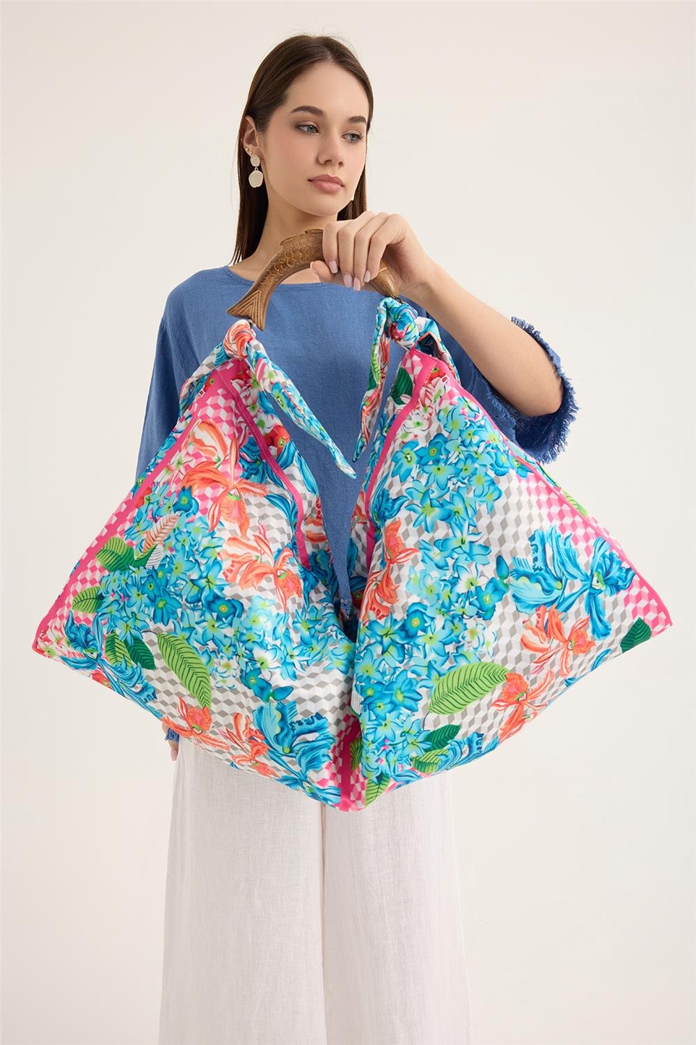 Çanta Renkli Çiçek Desenli Ahşap Balık Şeklinde Saplı